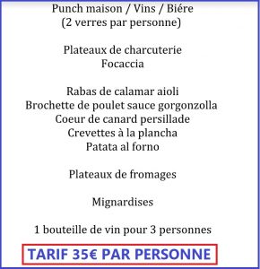 On aura un menu spécial Entrée/ plat/ dessert/ Punch / vin pour 35 euros chacun à payer sur place, voici le menu: